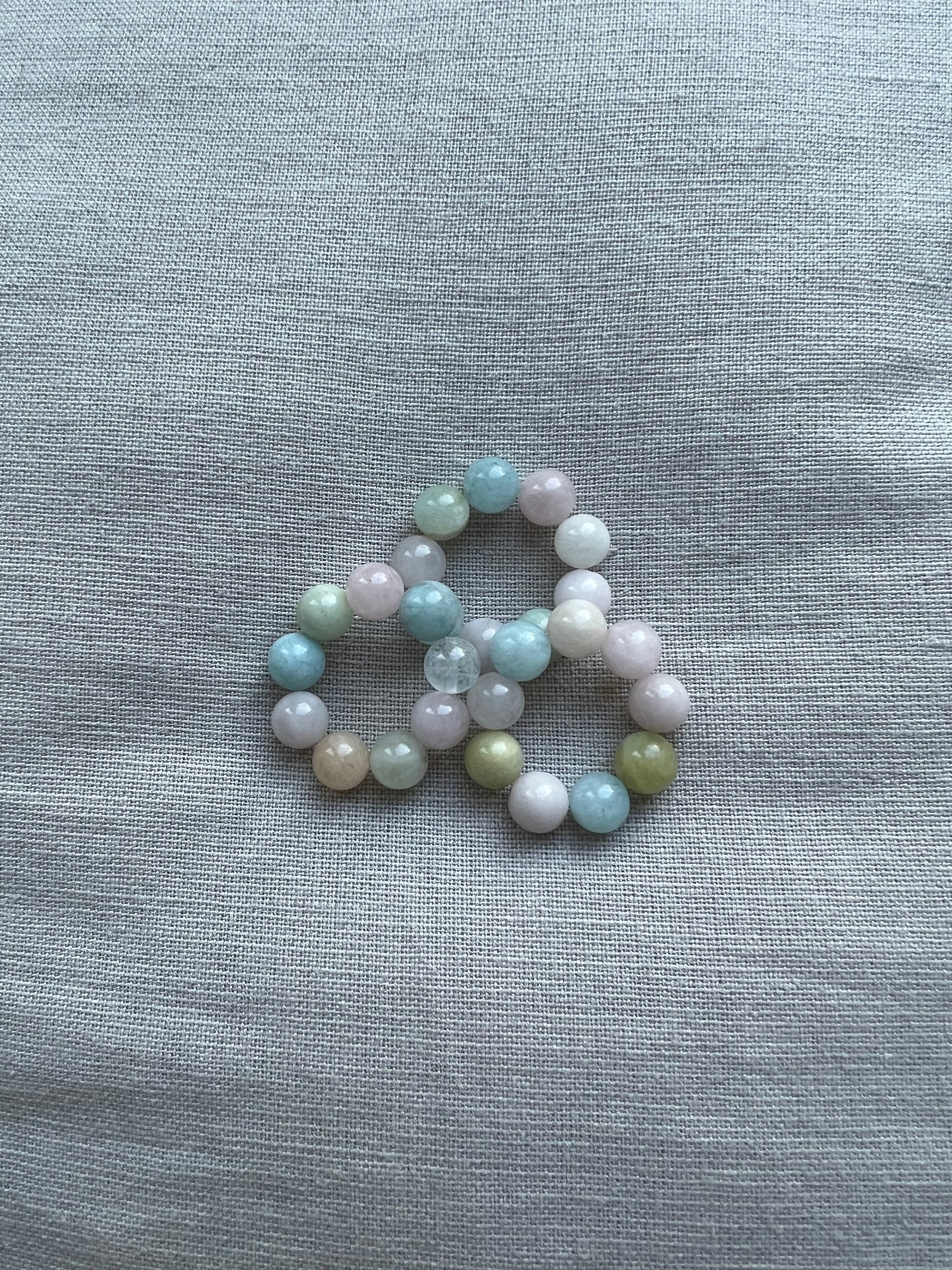 the COTTON ring is made of different colored morganite stone beads.