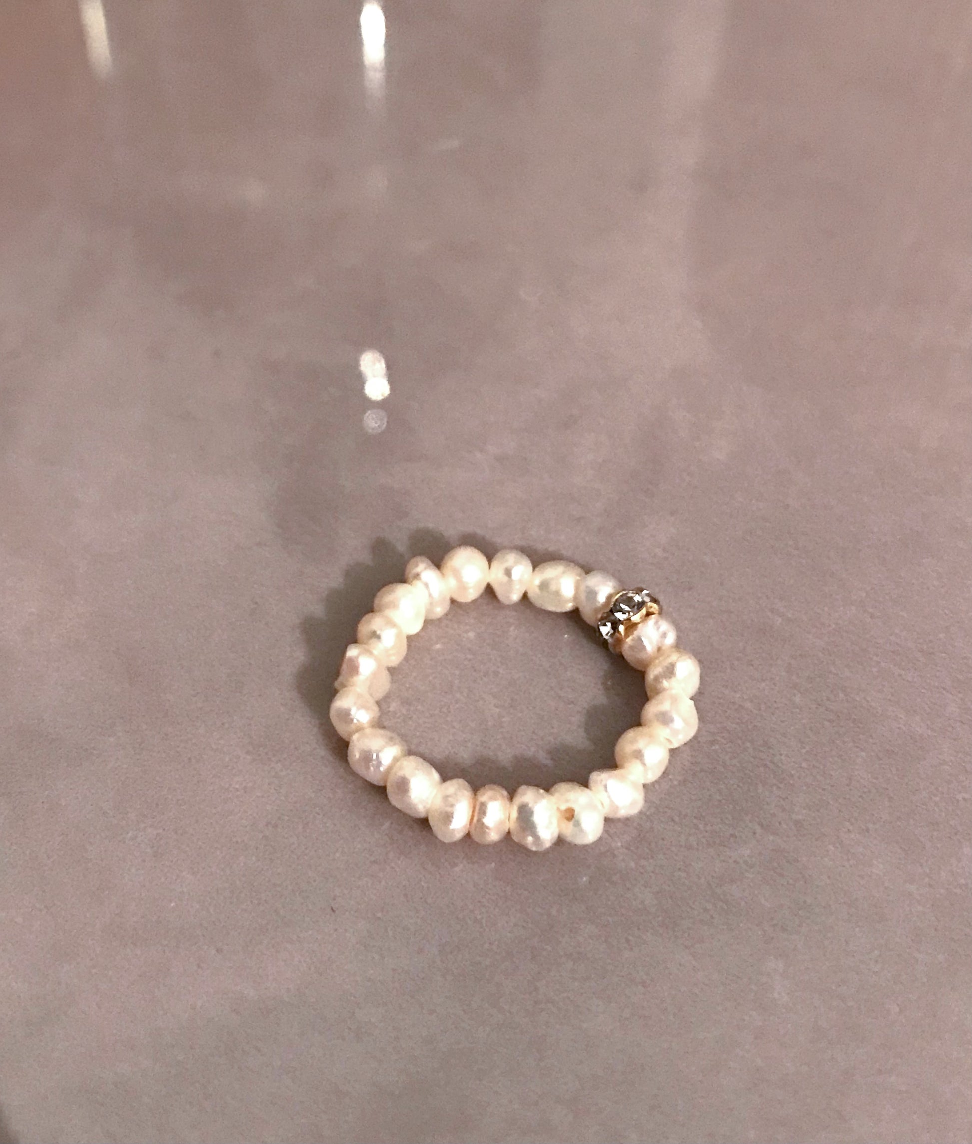 ring 'diamond mini' is made of freshwater pearls and a 24k gold plated rhinestone bead.