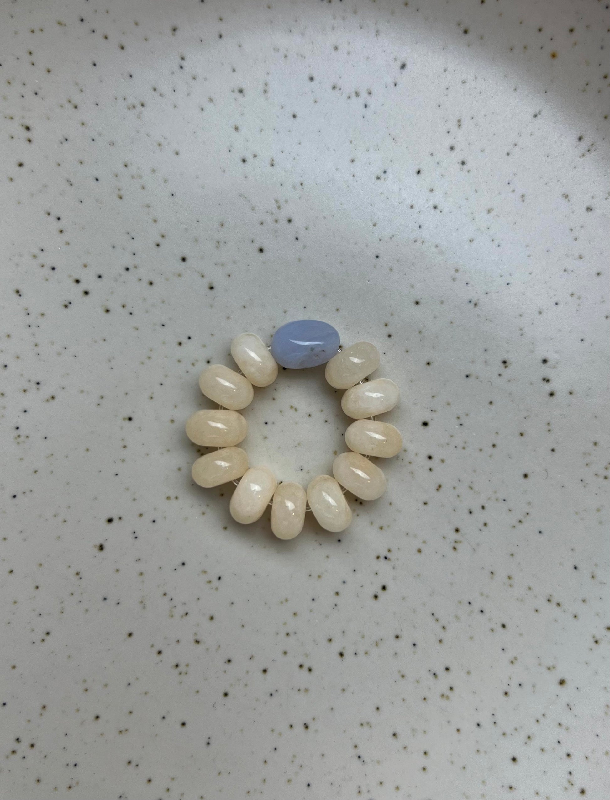 the SALT ring is made of angelite stone beads and a calcedony stone bead